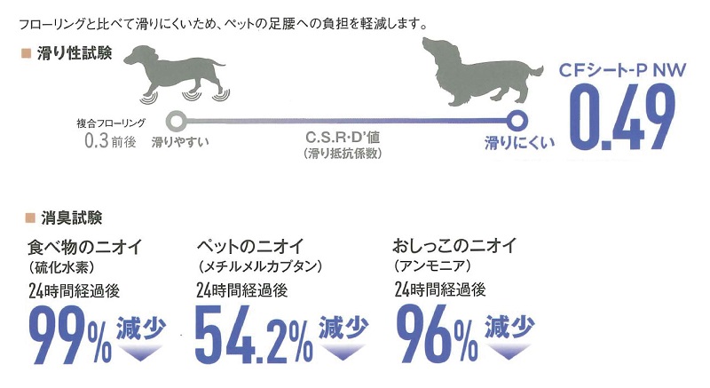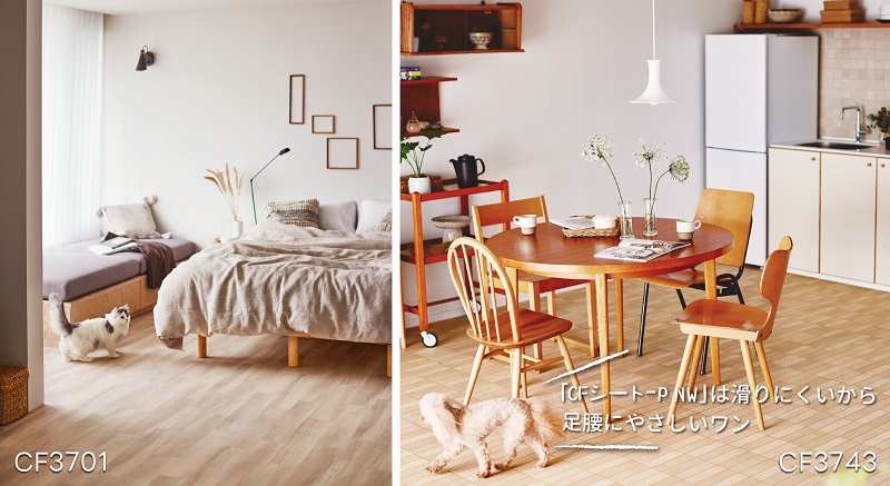 国内で展開するクッションフロアで唯一の「NW※ノーワックス」機能がついた「CFシート-P NW」。ペットとの暮らしに対応したクッションフロアとしては国内メーカーにおいて最多のラインアップとなっています。土足にも対応しているため、店舗や施設にもおすすめです。