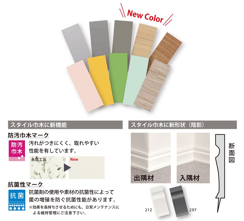 市場のニーズを徹底的に調査し、規格とカラーを見直しました。さらに、市場で増加傾向にある、独自性の高いデザインのスタイル巾木には、防汚・抗菌と陰影のある新形状を追加いたしました。