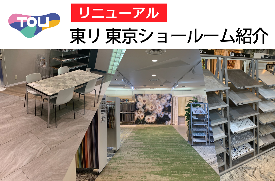 先週の休日、自宅近所の飲食店で改修工事が行われていました。「今度一杯行ってみよかな」などと思いながらプライベートモード満載で通り過ぎようとした時、ふいにドドンと積まれた施工中の東リタイルカーペットの箱を目の当たりにしました!「うおっ!実際に私の近い未来のライフスタイルもデザインしているのか!!」と、このコンセプトをグッと身近に感じました。だから何なのかは置いといて、そんな気持ちで、新製品の展示にリニューアルされた東リ 東京ショールームへお伺いしてきました。