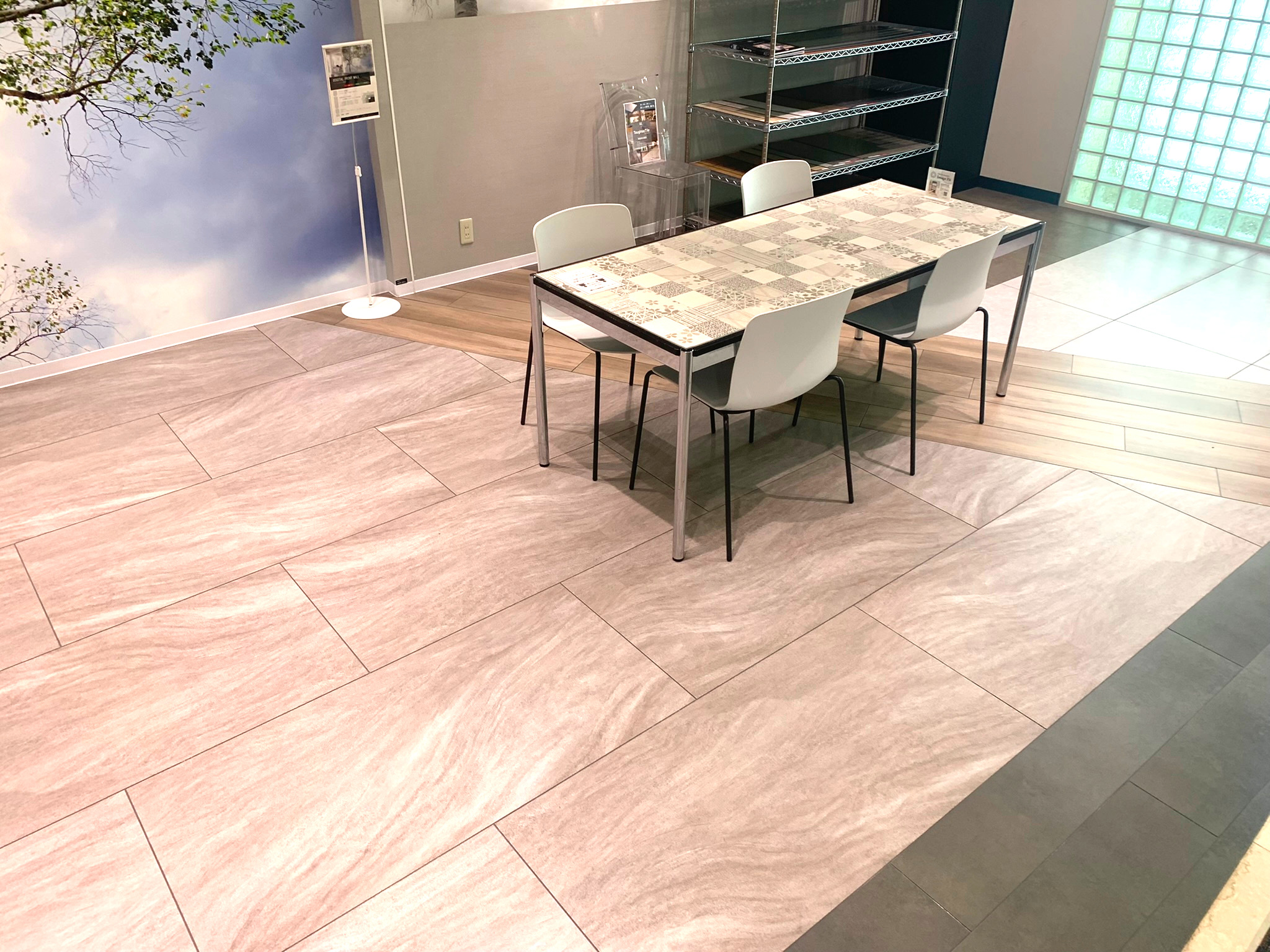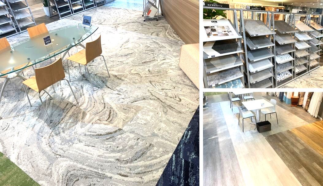 東京ショールームに入ると、まず、目を引いたのが受付手前の床に敷かれていた、2021年に発売の1000×1000mmサイズの 大判タイルカーペット「グランフロー GX6150L」。 「グランフロー」はその大きさとダイナミックなデザインから空間に広がりを演出します。製作には「マーブリング技法」と言われる技術が使われており、雄大な流れが表現されている製品です。2022年の新製品はご来場者にじっくり見ていただけるように、左右の打ち合わせスペース周辺に敷かれていました。お伺いした際も、ショールーム内では多くの施主様やインテリアコーディネーターの方などが、真剣に製品を選んでみえました。※ショールームスタッフの方々、お忙しい中ご協力ありがとうございました。
