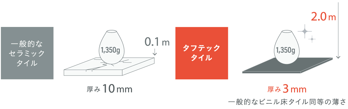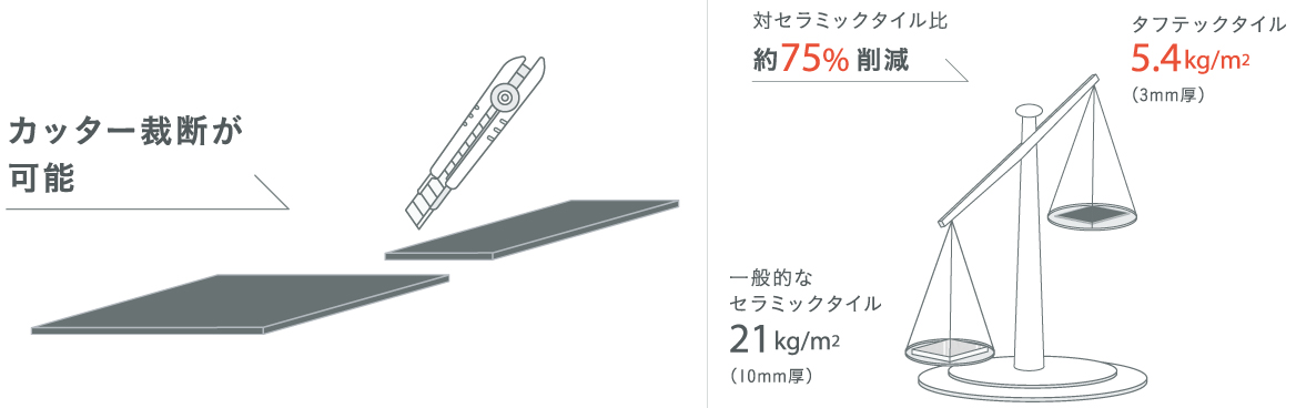 2.従来のビニル床タイルと同等のわずか3mm厚の軽量設計とカッターで切れる施工性。