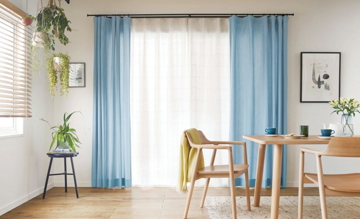 1台にドレープとレースを前後に配した「ダブル」。それぞれ上げ下げして、カーテン感覚で生地を使い分けできて、でら便利。コンパクトなボックスに前後2枚のプリーツカーテンが格納されとるもんで、窓周りがでらスッキリと収まっとるわ。ペアタイプのプリーツカーテンやと格納時のたたみ代が大きくなるもんで、大きなカーテンボックスがないと視覚的にもちょっとワヤやったけど、本製品やったら直接窓枠に取り付けても違和感がないと感じるて。前後にドレープとレースを配しとるもんで、視線を遮るという機能と採光という機能を無段階に調節でき、またカーテンを2枚前後に配することで、断熱効果も期待できるんとちゃう。