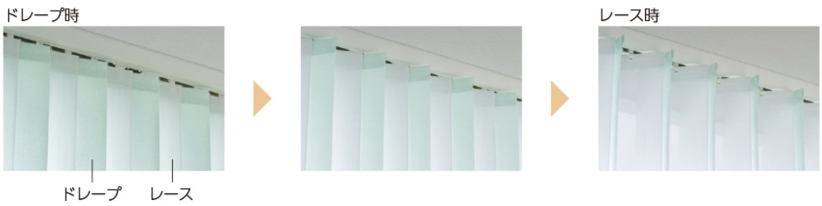 2.ドレープに対してレースが斜めに配置され、ドレープに合わせてレースが回転するため、高い眺望性を実現。