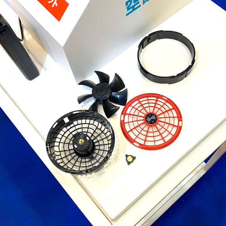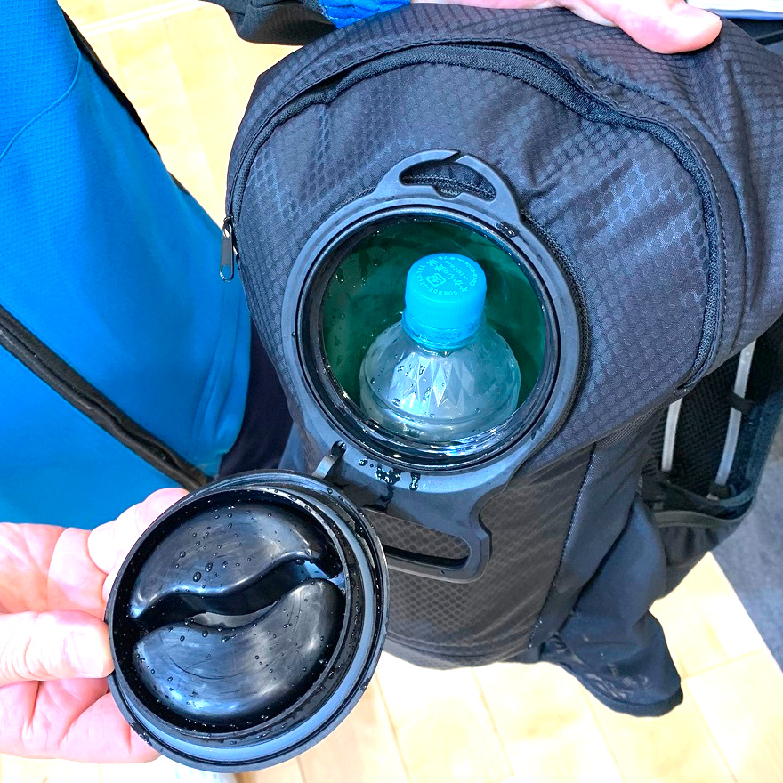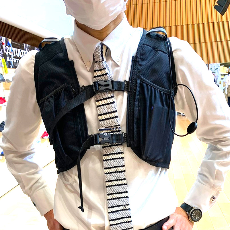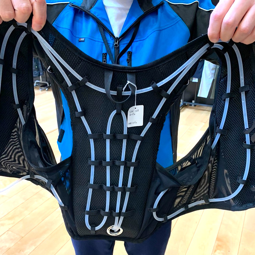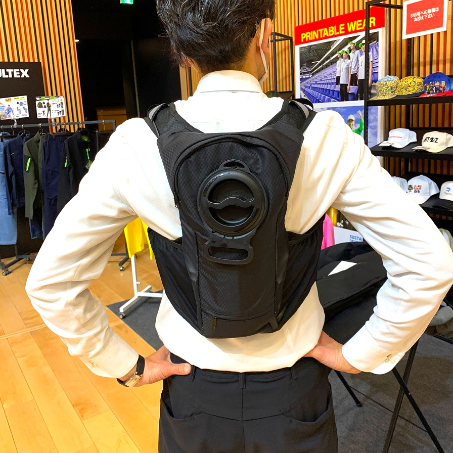 こちらは、今夏に向けて発売準備中の「水冷服ベスト」。冷水が循環して身体を冷やします。。背面に少量の水を入れた後、凍らしたペットボトルで入れた水を冷やします。電源をONするとチューブに冷水が流れて身体を冷やします。実際に着てみましたが、ヒヤッと冷たく感じました。