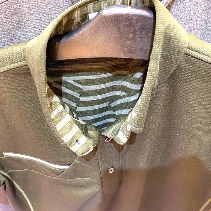 こちらのポロシャツは裏面に「キシリトールパウダー」「ストーンパウダー」がプリントされており、接触冷感機能を有しています。汗を利用して冷却される素材で、抗菌防臭機能もあるとの事。