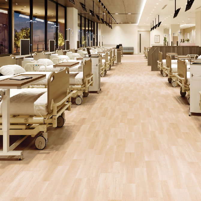 ホスピリュームNW、SFフロアNW、ケアセーフNWともに採用している柄で美しいメイプル柄が、空間を明るく、安心感を与える。