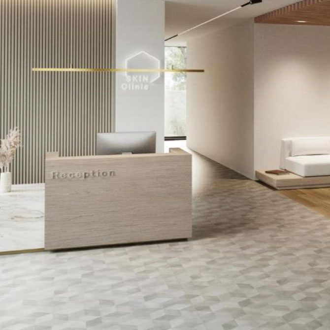 モダンで落ち着いた風合いの六角形タイル柄で空間のアクセントとなる。