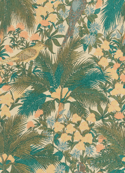 南国の情緒あふれる鳥や花を色鮮やかに織り上げました。