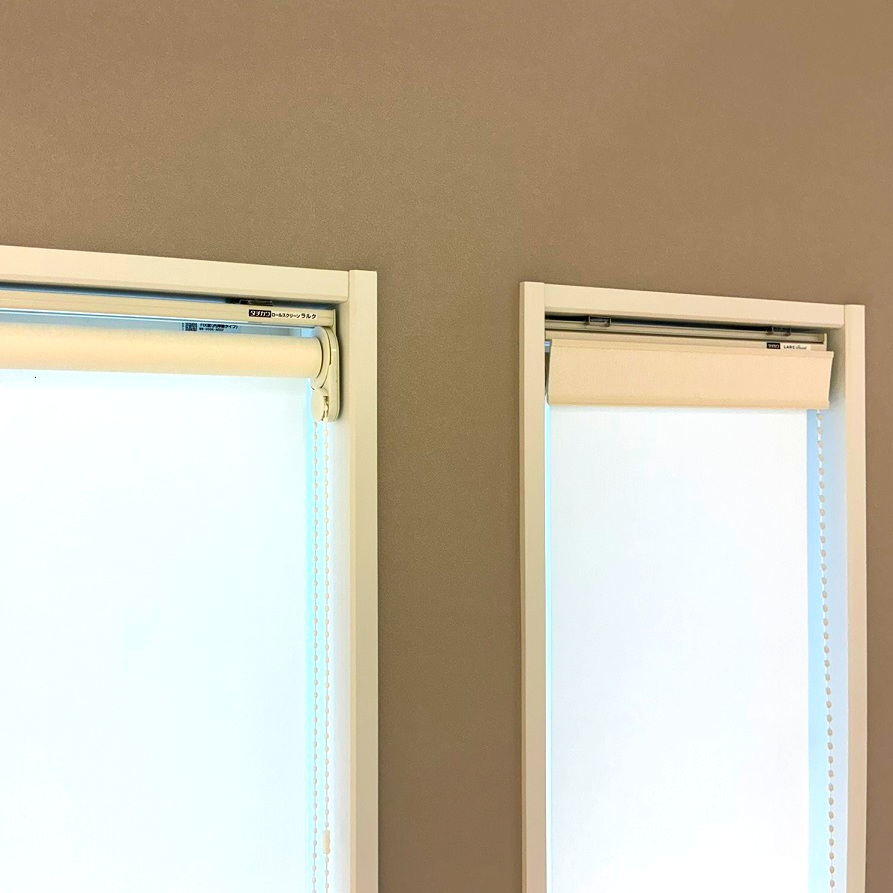 右側の窓はサッシ下部に開閉ハンドルがあるため、ロールスクリーンを閉めた際に開閉ハンドルに干渉する可能性があります。そこで本展示では、生地を逆巻使い(オプション)にして納まりを調整しています。こうした納まりの違いも、実物をご覧いただけます。