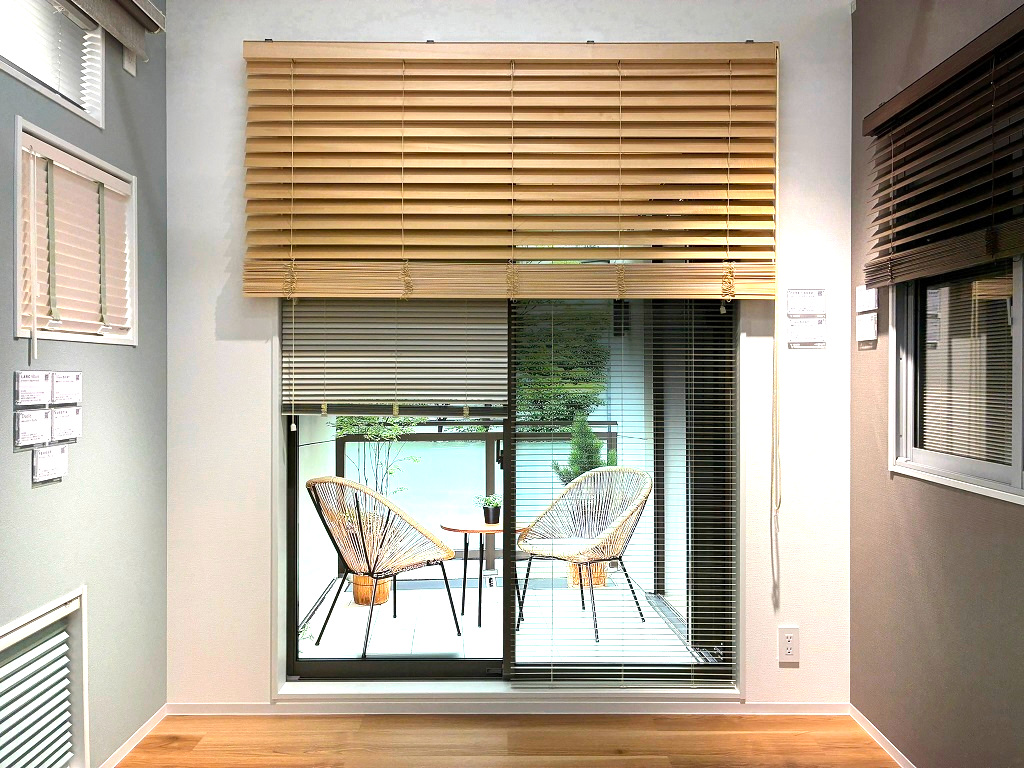 腰壁のある集合住宅のバルコニーを想定し、ブラインドの高さによって外部からの視線がどの程度遮れるかを、実際の見え方で確認できます。「この高さなら視線が気になりにくい」といった感覚が理解できます。