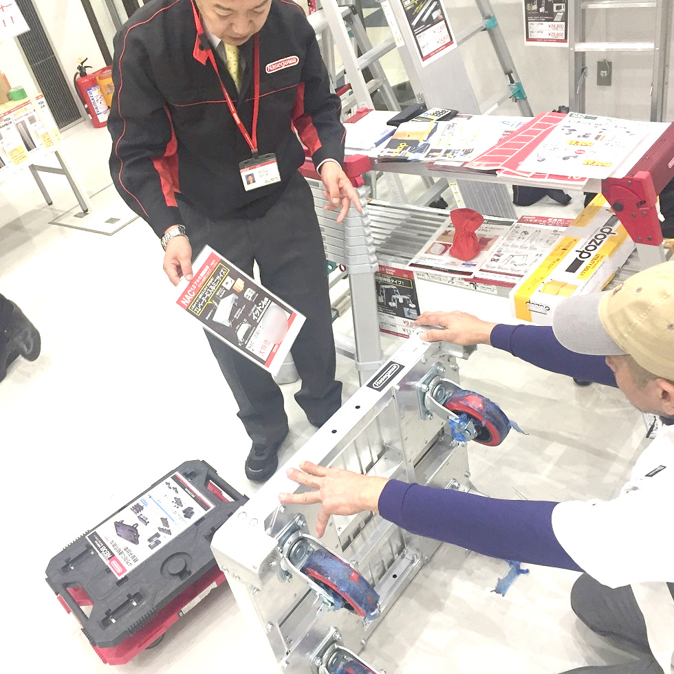 長谷川工業コーナーでは、ゴツいけど軽い「イットン台車」を熱心に見て、
