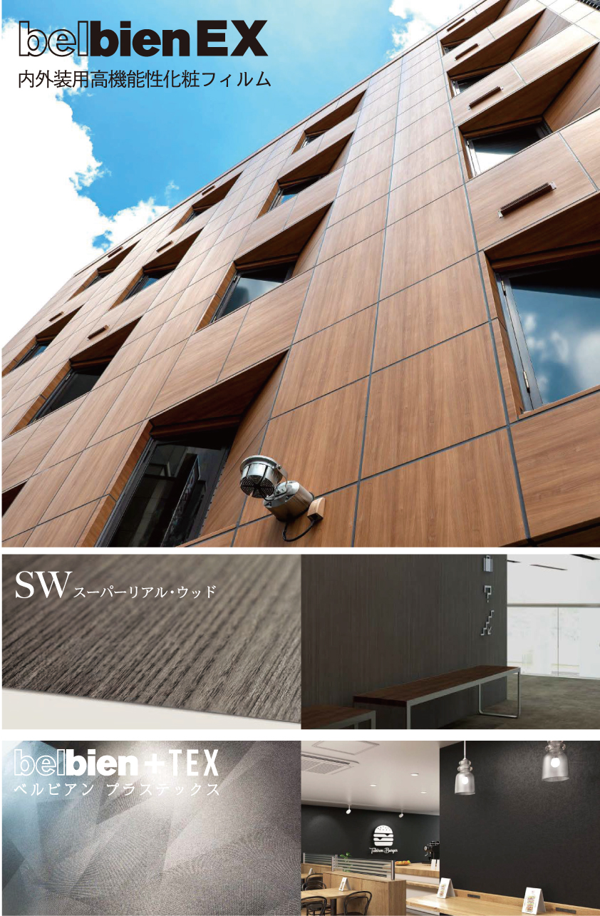 ベルビアンは、1980年の販売開始より、国内にあるタキロンシーアイの自社工場で生産されており、信頼の品質です。サンプルブックへは、最新のデザインを含む全653柄が掲載され、施工事例などを掲載したインフォメーションブックなども同梱されます。ラインナップには、新柄に加えて、屋外耐候性を有する「EXシリーズ」や、特別な印刷方式を採用した「SW スーパーリアルウッド」、単色に様々なエンボスで表情を出した「プラス テックス」など好評なシリーズも引き続き掲載しています。